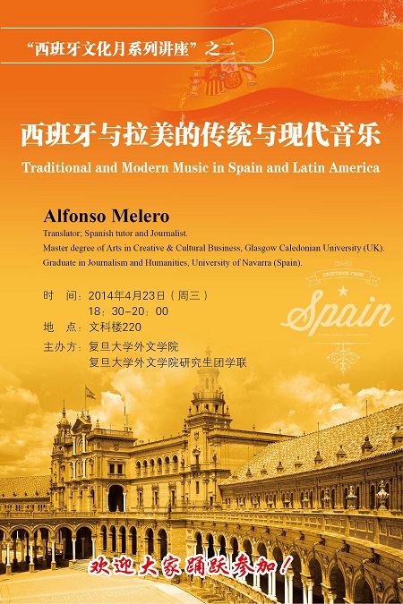 由外文学院主办的西班牙文化月活动继续火热进行,接下来推出系列讲座的第二场: “西班牙与拉美的传统与现代音乐”, 主讲人是毕业于西班牙纳瓦拉大学新闻学的Alfonso Melero, 4月23日(周三)18:30在文科楼220,期待您的参与!