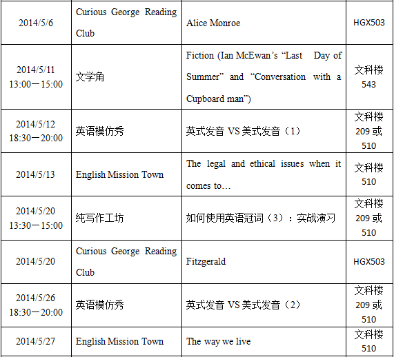 大学英语教学部第二课堂5月精彩继续呈现!主题涵盖文学、发音和写作,同学们若感兴趣,可前来听讲。