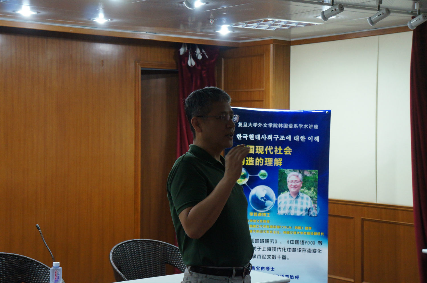 首先,来自韩国交通大学中文系的李哲源教授以《韩国现代社会构造的理解》为主题做了讲座,对韩国的政治体制、社会结构、地区差异、社会财富的不均衡等问题进行了说明并阐述了自己的看法。在问答环节,李教授对同学们提出的韩国国会议员选举、朝韩统一、韩国对脱北者的看法等问题做了详细的解答。