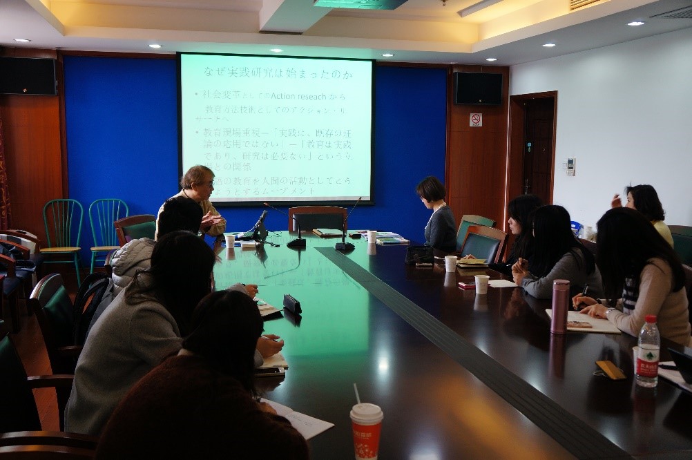 讲座在细川教授轻松愉快的开场白中开始。细川教授首先指出了将教学现场的实践与教育学研究相结合的必要性。接下来,他简要地介绍了教育学中实践研究的历史,讲述了实践研究是如何脱去了其政治意义,开始转变为对人类活动本身的研究。教授又由此讲到了实践研究在日语教育中的作用。他认为,语言的习得应该与其他各领域的社会团体相结合。通过一个“主题”,让学习者在实践中学习如何运用语言。细川教授特别播放了自己进行教学实践研究的视频,给了大家许多启发。之后的提问环节,细川教授回答了在场老师与学生在日语教育现场中进行实践研究时会遇到的问题,例如如何引导学生进行讨论、具体进行实践研究时的注意点等。