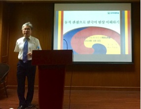 张教授首先对韩语语法中出现的很多不规则现象进行了详细分析。然后结合语言化石,语法化现象等概念讲述了研究韩语语法问题时要进行动态分析。
