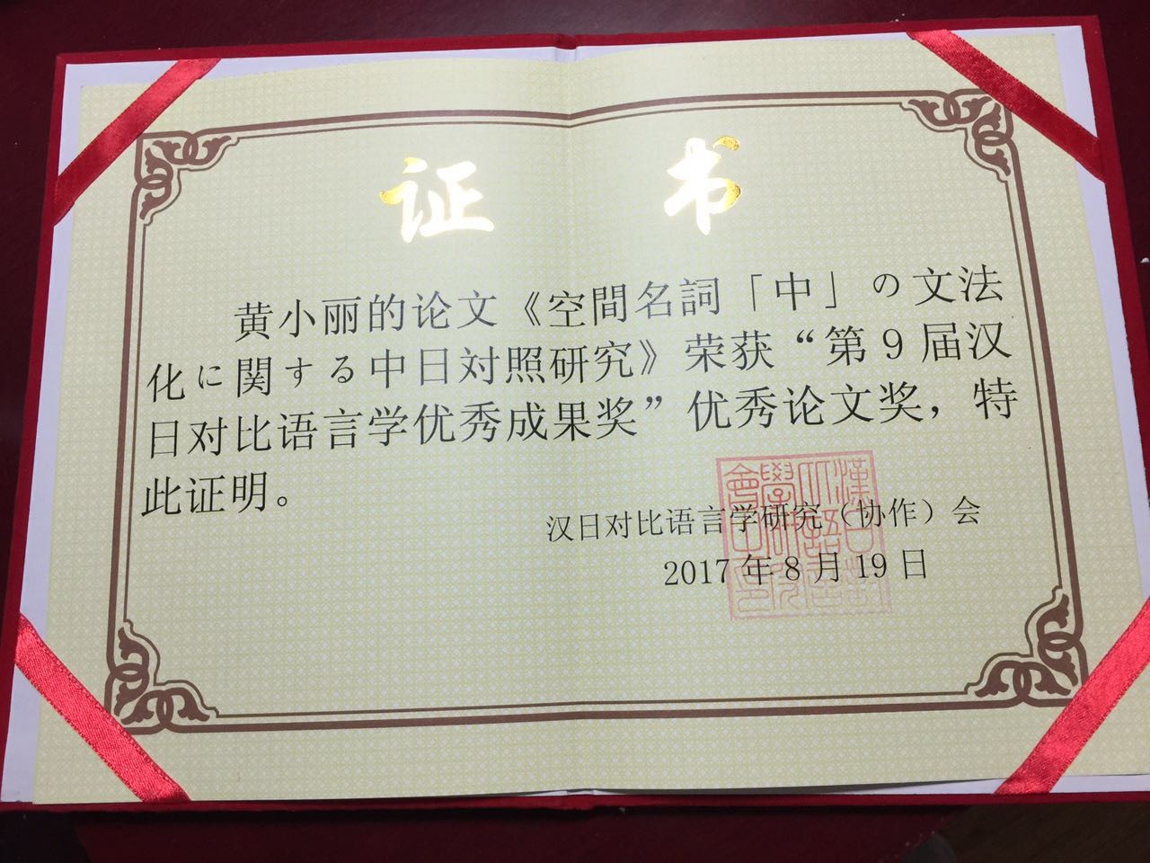 此次会议评出了“第四届中青年汉日对比语言学优秀成果奖(第9届汉日对比语言学优秀成果奖)”,我院日文系教师黄小丽获得优秀论文奖。