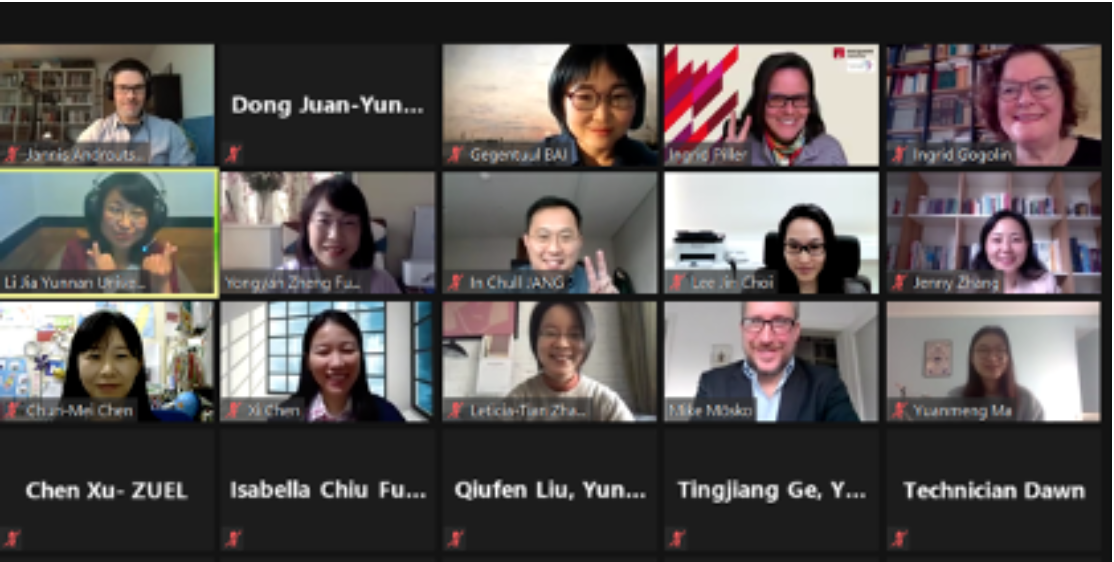 第二天的研讨会国际场由澳大利亚麦考瑞大学的Ingrid Piller教授和德国汉堡大学的Ingrid Gogolin教授致开幕词。韩国建国大学的In Chull Jang博士、北京外国语大学的Leticia-Tian Zhang博士、英国中央兰开夏大学的Xi Chen博士、中国广州暨南大学的Hongqiang Zhu博士、中国台湾中兴大学的Chun-Mei Chen博士和澳大利亚麦考瑞大学的Gegentuul Hongye Bai博士分别介绍了国际、国内社会的多语抗疫成果。德国汉堡大学的医学和社会心理学家Mike Mösko教授和社会语言学家的Jannis Androutsopoulos教授对专家们的报告进行了点评。在中外学者利用问答时间进行了简短的交流后,Ingrid Piller教授致辞结束了本次研讨会。Ingrid Piller教授指出应急语言服务研究不仅对新冠危机进行了社会语言学探索,也为社会语言学领域内的跨文化对话开辟了空间。她强调全人类应该跨越语言和文化的国界,团结抗疫。