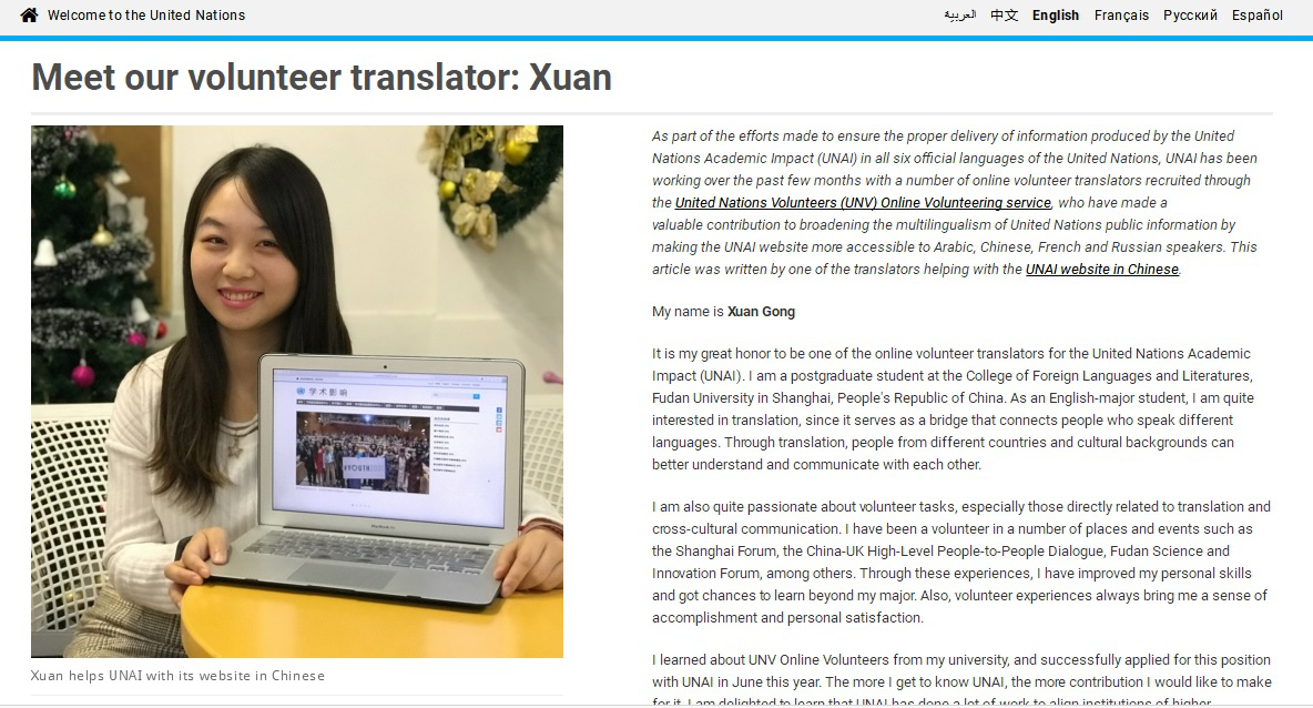 外文学院鼓励学生发挥专业优势和特点,通过灵活多样的形式积极参与国际组织志愿服务与实习实践工作,其中包括通过联合国在线志愿者服务参与联合国学术影响(The United Nations Academic Impact)项目,为传播联合国信息贡献力量。近日,UNAI网站刊载了一位来自复旦外院的中文翻译志愿者的工作心得。