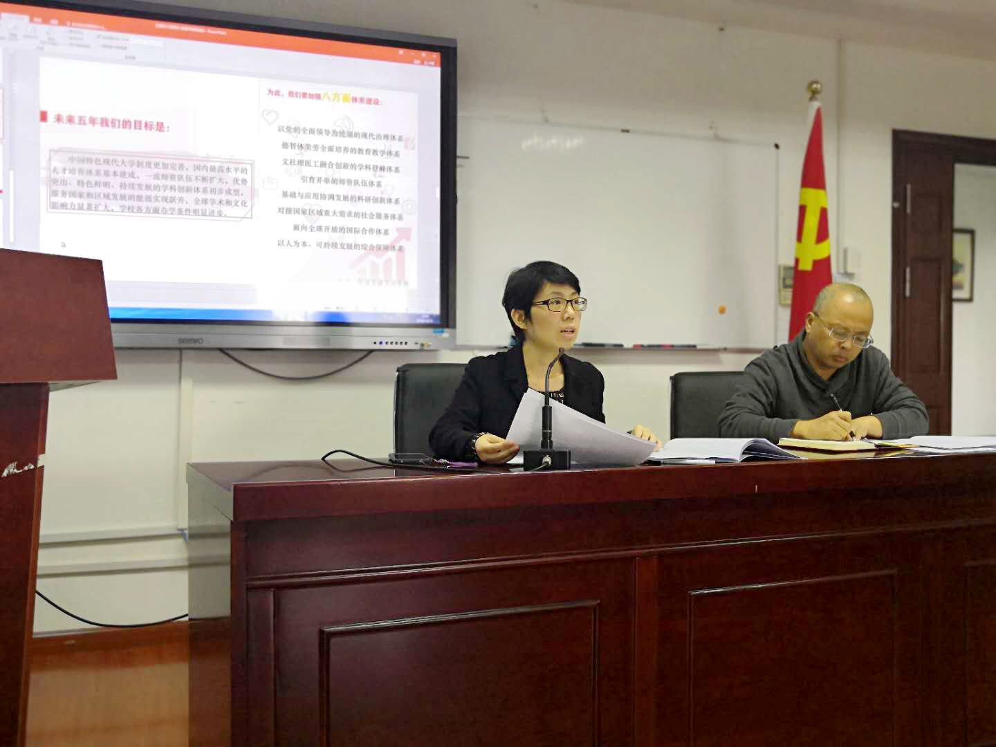 罗英华书记向大家传达了题为“立德树人固根本 改革开放再出发 全面开启中国特色世界顶尖大学建设新征程”的十四届党委工作报告精神,从过去五年学校的主要工作回顾、新时代威客电竞(vkgame),为竞技而生的历史使命和战略目标、开创中国特色世界一流大学建设新局面、一流党建和思想政治工作引领一流大学建设四个方面介绍和解读了报告的主要内容。罗英华表示,党代会报告是集体智慧的结晶,充分体现了全校上下的共同愿望,是学校加快推进“双一流”建设、全面开启中国特色世界顶尖大学建设新征程的宣言书,是指导今后一个阶段学校各项工作的纲领性文件。罗英华要求,全院党员和师生员工要从全局和战略的高度,充分认识学习贯彻第十五次党代会精神的重要意义,把学习贯彻党代会精神作为当前和今后一个时期一项重要的政治任务,努力在深刻把握领会精神、深入贯彻落实上下功夫,紧密结合学校和学院改革发展的实际,深刻领会和准确把握党代会报告的精神内涵,认真落实党代会的各项工作部署,把学习贯彻党代会精神转化为干事创业的强大动力,全面加强学院党的建设,加快“一流学科”建设,认真做好本科教学迎评工作,立足本职,勇于担当、锐意进取、争作表率,以实际行动和工作实绩推进学院各项事业的发展。