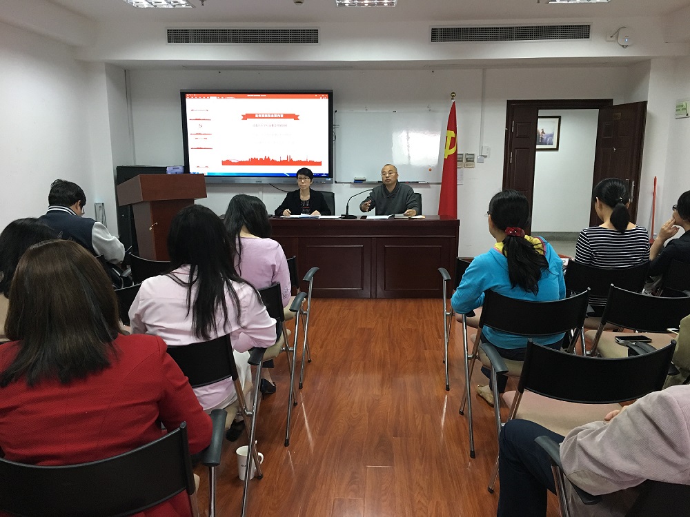 2018年10月16日下午,外文学院分党委在文科楼510会议室举行中心组(扩大)学习会议。学院党委委员、教工党支部书记、行政后勤支部党员参加会议,学院党委书记罗英华主持会议。