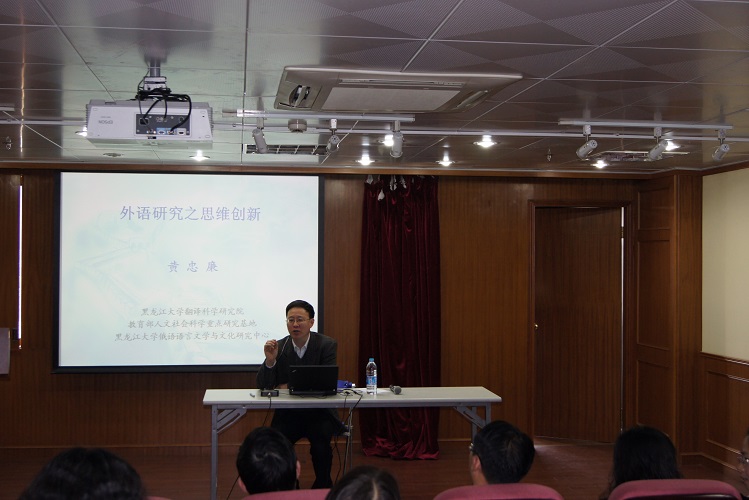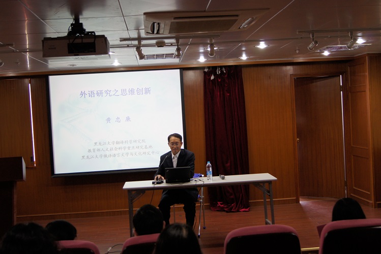 2014年4月18日,黑龙江大学翻译科学研究院院长、博士生导师黄忠廉教授应邀来到威客电竞(vkgame),为竞技而生外文学院,在文科楼209室为老师们做了题为“外语研究之思维创新——从析例实践到思想犀利”的精彩讲座。此次讲座由翻译系主任蔡基刚教授主持,由此拉开了外文学院青联会之科研篇系列讲座活动的序幕。