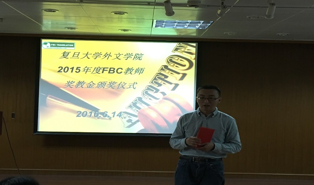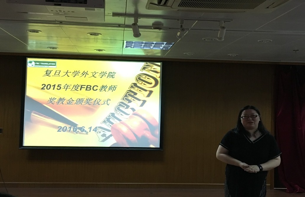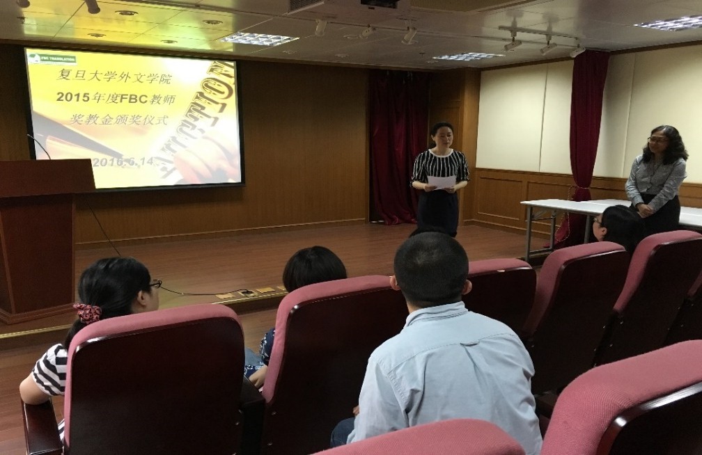 2016年6月14日下午,外文学院在文科楼209室举行2015年度FBC教师奖教金颁奖仪式。出席仪式的有FBC公司人事经理俞晓蕾、外文学院党委书记李倩、副院长卢丽安和获奖教师。颁奖仪式由外文学院副院长卢丽安主持。