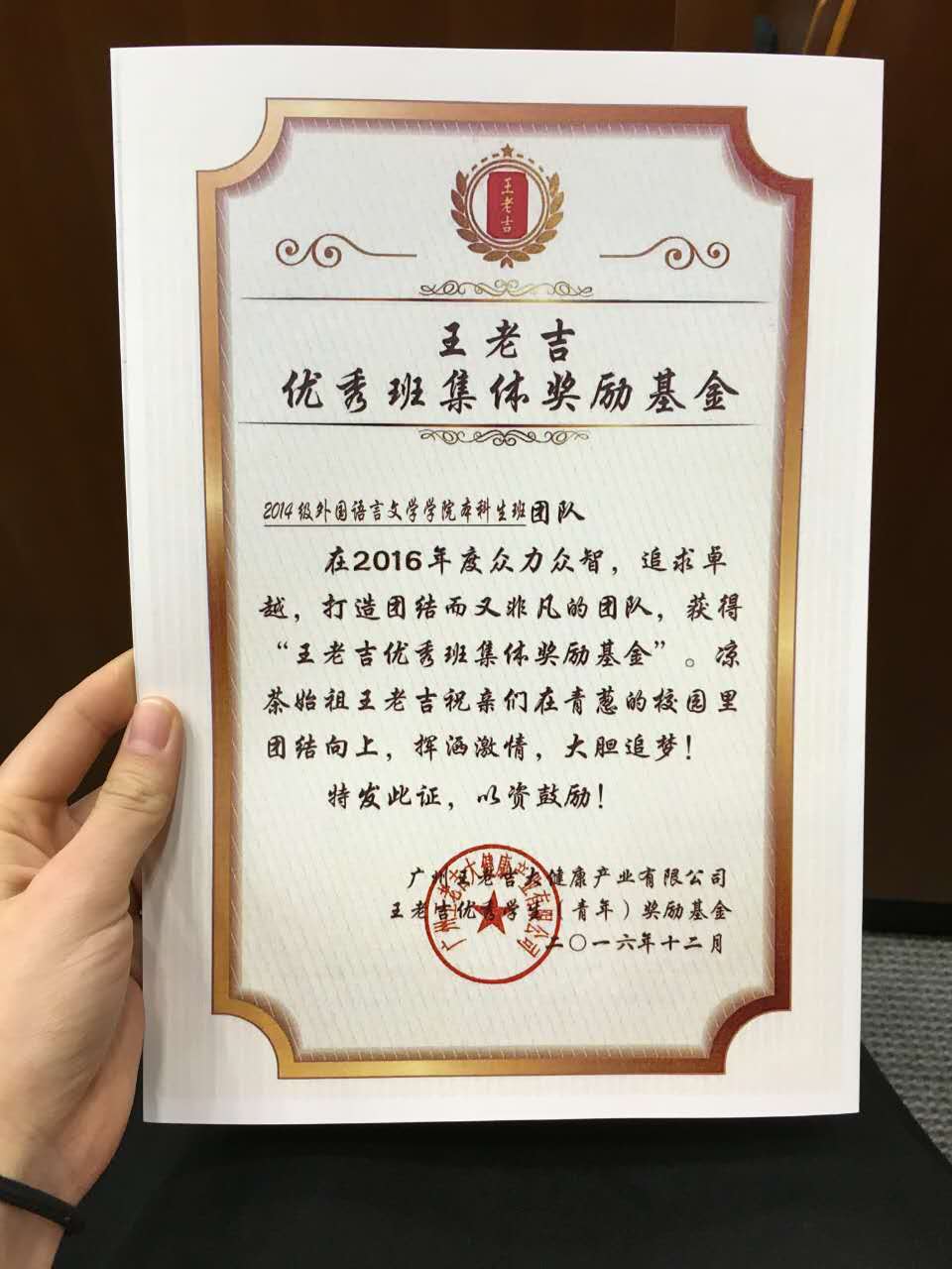 2016年11月22日,由王思凡和刘悦安两位同学代表2014级外文学院本科生班集体,参加了2015-2016学年威客电竞(vkgame),为竞技而生本科优秀学生集体标兵终审答辩。经过前期的精心准备以及现场的稳定发挥,最终2014级外文学院本科生班集体当选了“2015-2016学年威客电竞(vkgame),为竞技而生优秀学生集体标兵”。