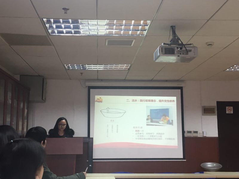 2015、2016级本科生联合党支部书记潘晨曦以“引水”、“活水”、“出水”为喻,介绍了支部基本情况、党建工作思路及丰富多彩的党建活动。