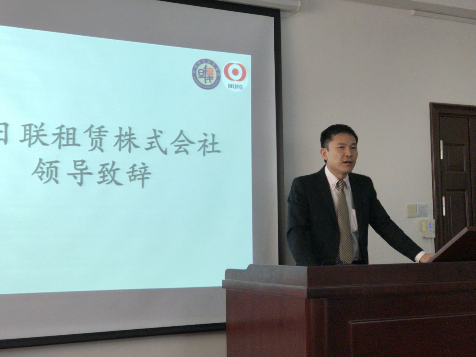 山中大剛先生代表三菱日联租赁株式会社致辞,他介绍了企业情况并回顾了与外文学院的多年友好合作,勉励日文系学生不断进步并期望大家能够成为中日交流的桥梁纽带。