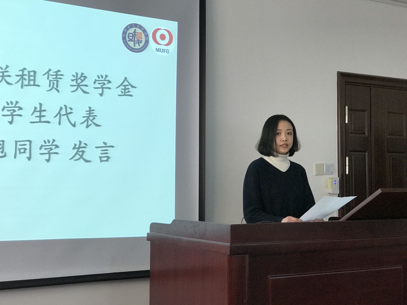 邹波老师宣读了获奖学生名单,2014级日文系赖楚翘同学代表获奖学生发言,表达了对设奖方的感谢,表示自己会不断努力,努力为中日友好发展贡献一份绵薄之力。