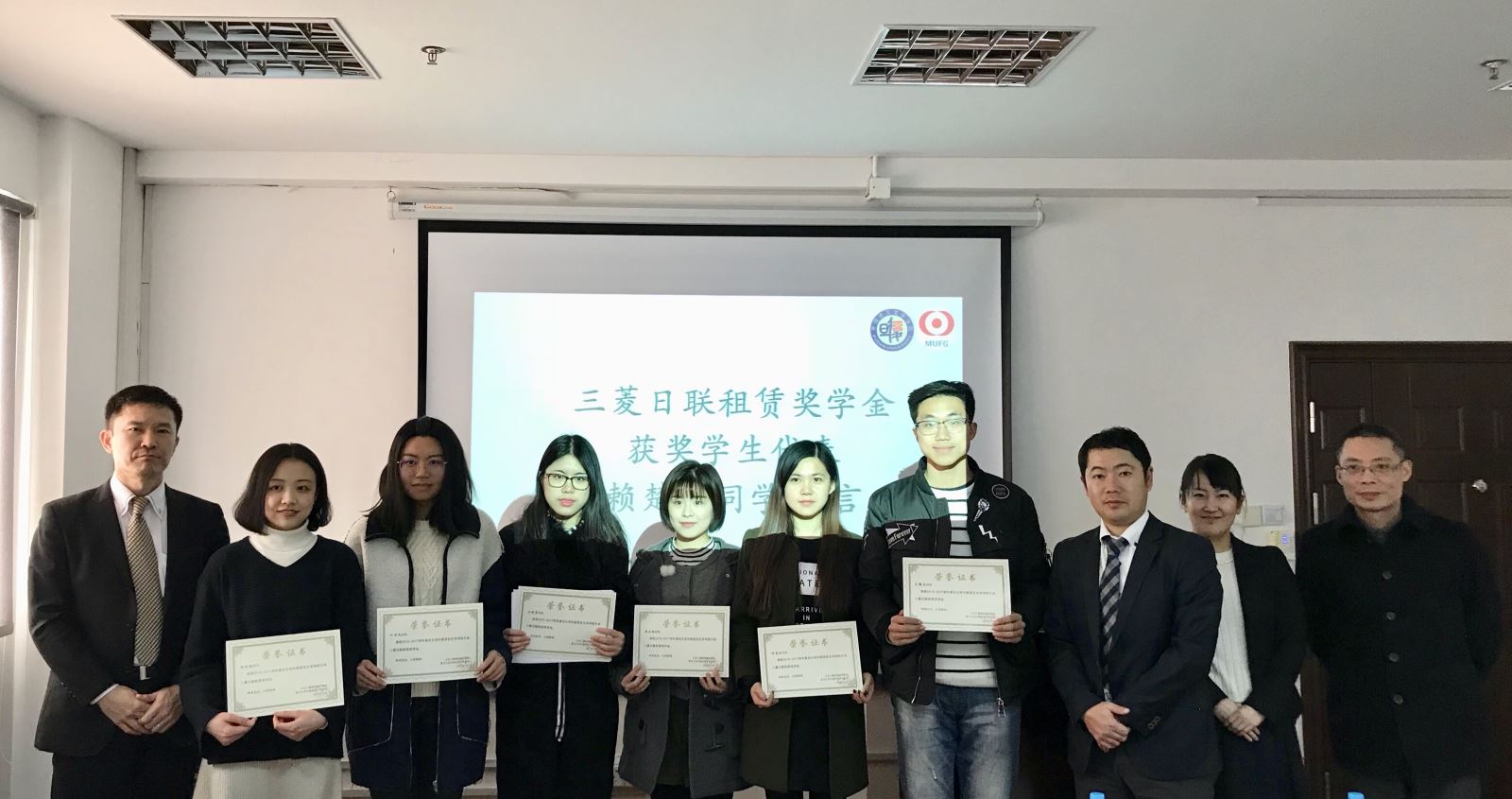 2017年12月26日下午,外文学院三菱日联租赁奖学金颁奖典礼在文科楼543会议室举行,三菱日联租赁株式会社副部长山中大剛、室长谷口麻衣子、高级经理中塚篤,外文学院副院长刘炜、党委副书记赵昕、学工组长茅盾、日文系系主任邹波、获奖同学及日文系同学代表出席颁奖典礼。