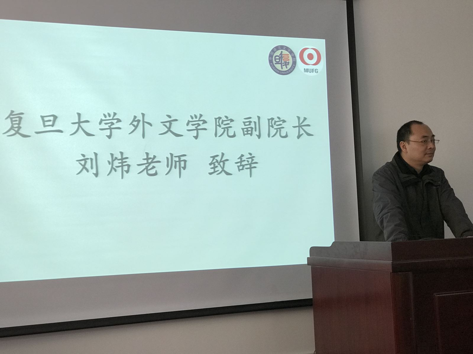 刘炜副院长代表学院致辞,他回顾了双方六年的友好合作,介绍了学院的奖学金评奖机制,表达了对于三菱日联租赁株式会社的感谢和对日文系学子们的殷切期望。