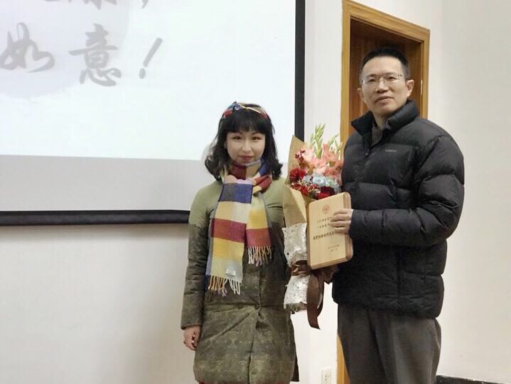 最后,青年教师代表向2017年告别三尺讲台的退休教师颁发荣休证书并献花,孙靖老师作为退休代表发言,和大家分享了从教三十多年来的心得和感受。
