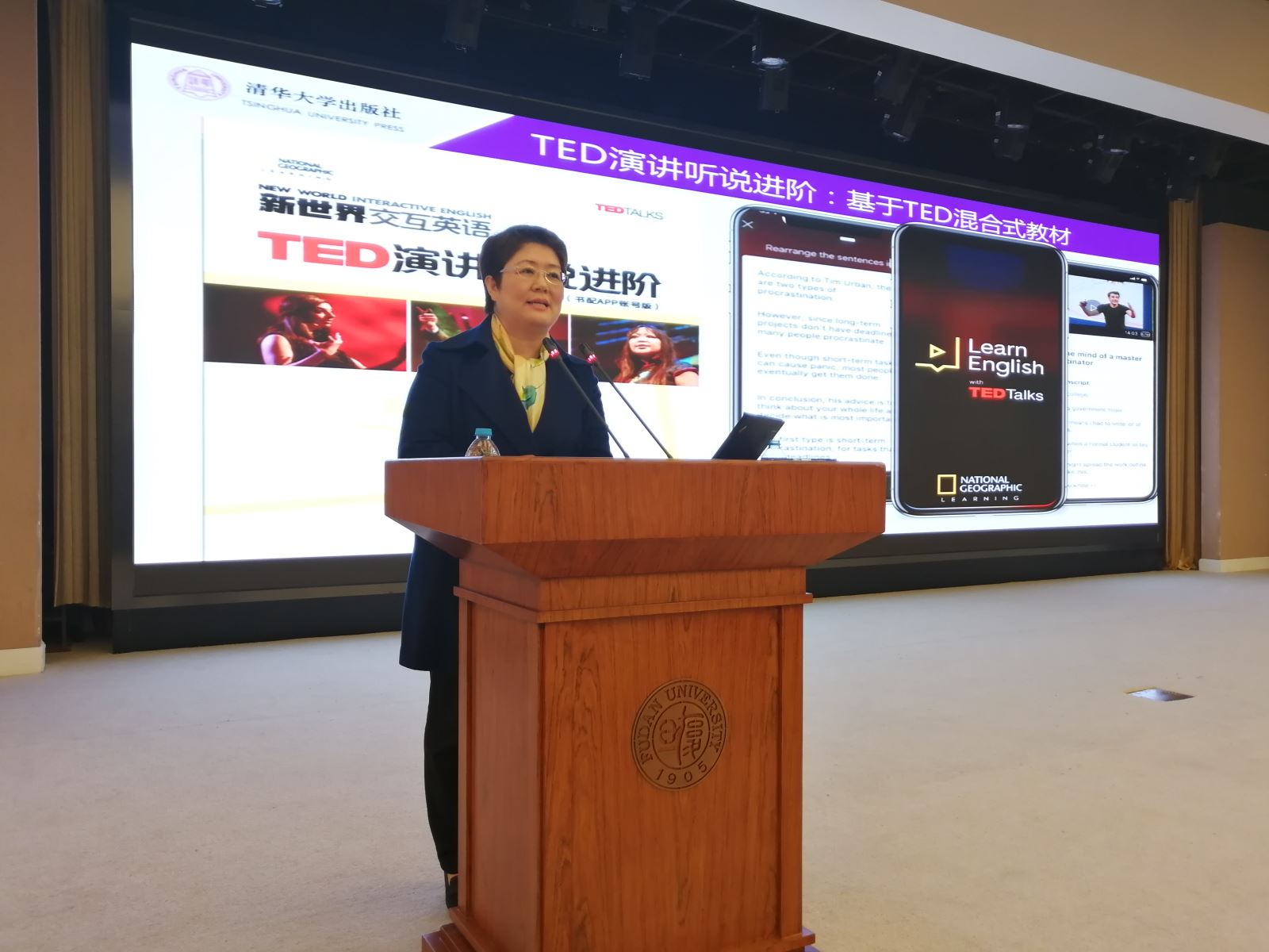 清华大学出版社外语分社社长郝建华发言,从资源建设、教学资源研发与服务、教育立项与品牌合作四个方面,简要介绍了清华大学出版社外语分社在外语教学方面所做的工作与成就,并提出与各校外语专业进一步深化合作,共同推动外语教育事业的发展。