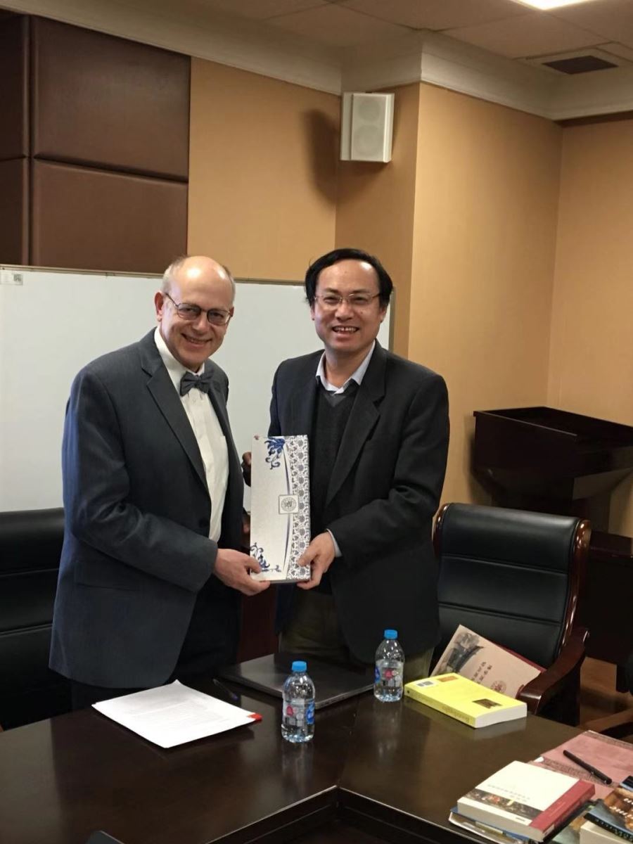 外文学院院长曲卫国代表外文学院接受赠书并交换了礼品。