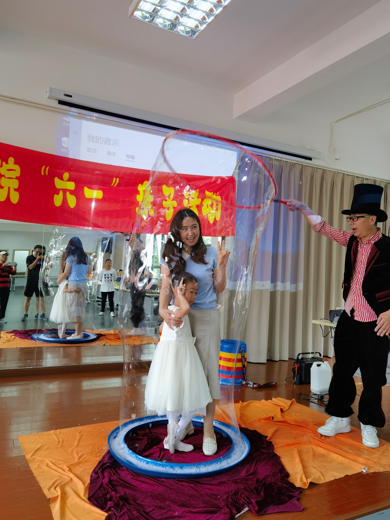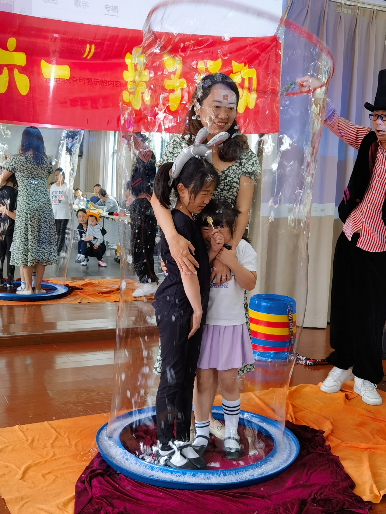 接下来是调动孩子热情的泡泡乐活动。娱乐师的泡泡制造表演妙趣横生,孩子们被带入一个泡泡的魔幻世界。大家与娱乐师热烈互动,活动室里一片沸腾。
